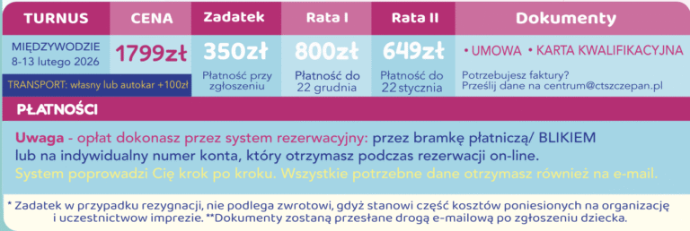 Jeśli po rezerwacji miejsca nie otrzymacie Państwo maila z potwierdzeniem i dokumentami – prosimy o pilny kontakt z biurem: Koszalin@ctszczepan.pl