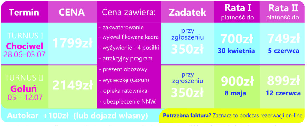 • wyżywienie: 4 posiłki: śniadanie, obiad, podwieczorek i kolacja,